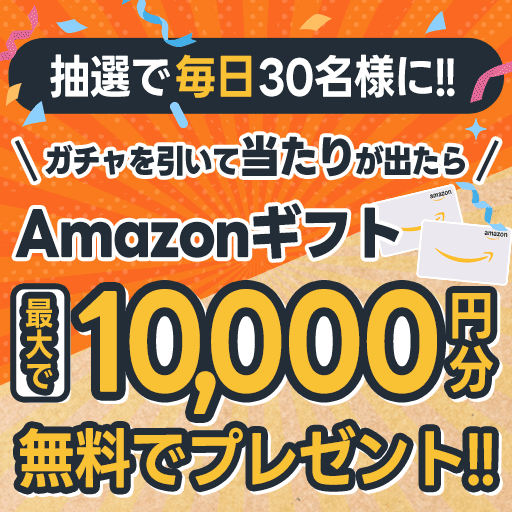 | 毎日抽選で30名様に、Amazonギフト“10,000円”が当たる!!ガチャを引いて当たりが出たらOK!!ハズレが出ても、何度でも挑戦できるからチャレンジするしかない!!... |